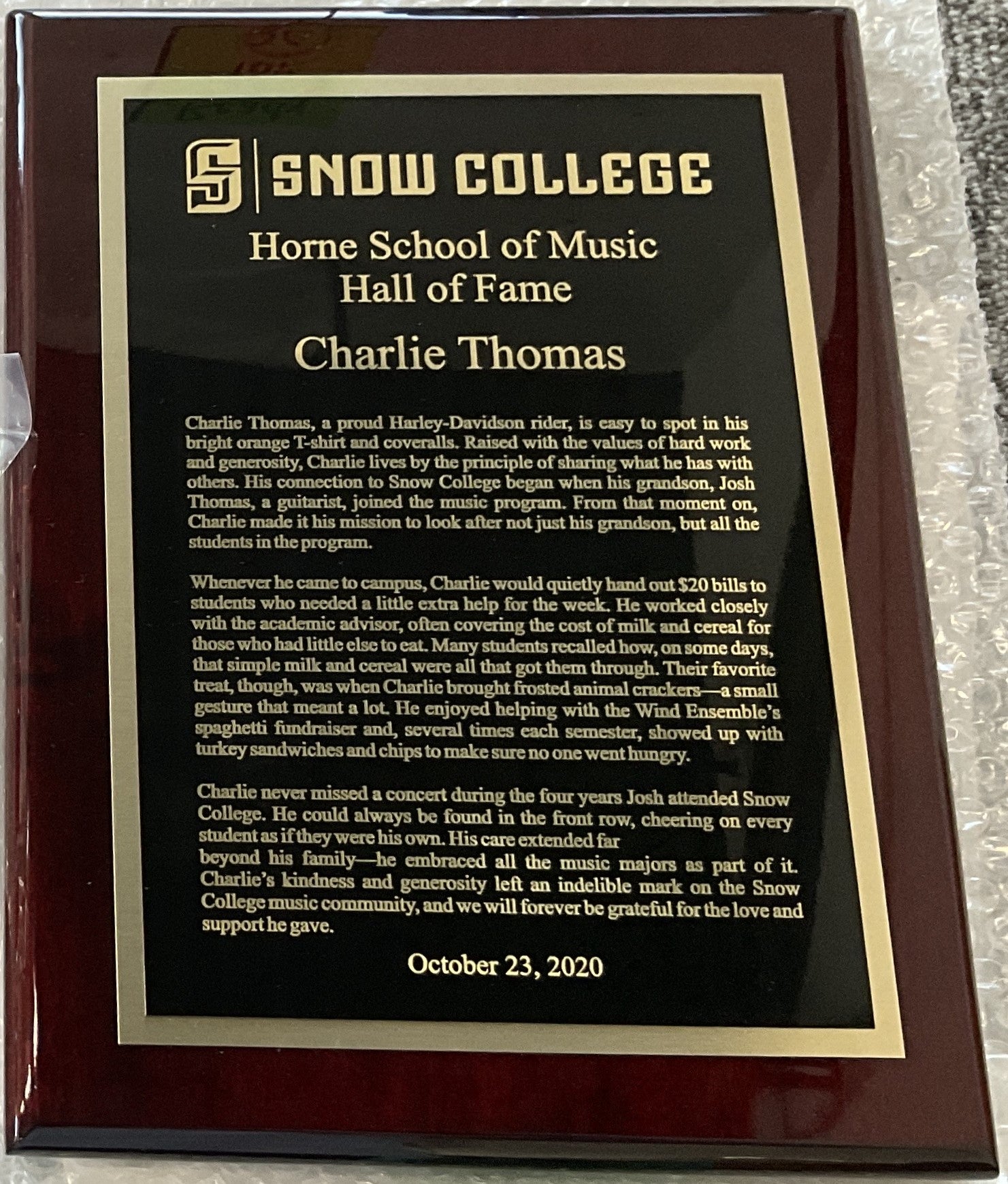 9x12 Rosewood Piano finish plaque with gold backing, black front, and gold lettering to commemorate the addition to the Horne School of Music Hall of Fame.